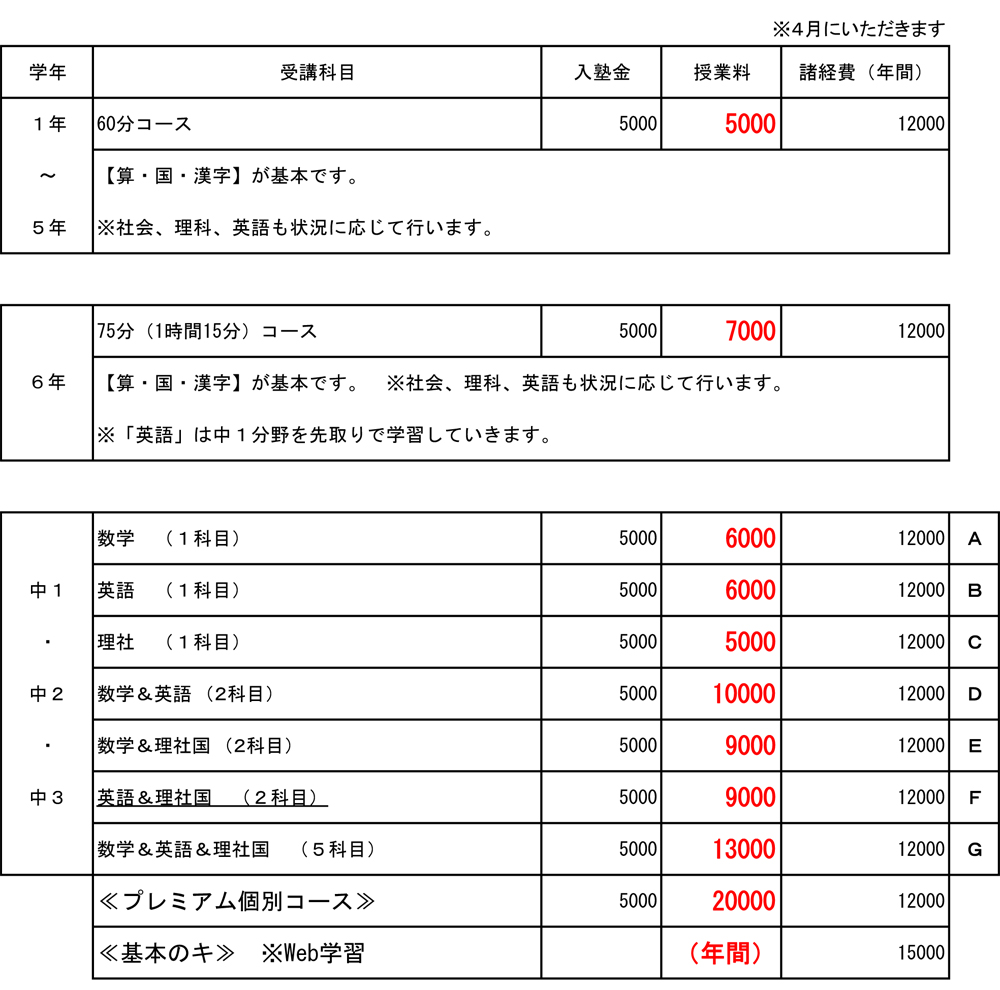 ※「入塾金」は初回のみかかる料金です。 ※「諸経費」は年初頭(4月)に月謝とあわせていただきます。 兄弟同時在籍のとき、1人分半額とさせていただきます。