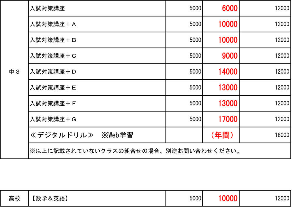※「入塾金」は初回のみかかる料金です。 ※「諸経費」は年初頭(4月)に月謝とあわせていただきます。 ※ 兄弟同時在籍のとき、「諸経費」は1人分半額とさせていただきます。 ※ 兄弟同時在籍のとき、月謝の合計から1000円引きとさせていただきます。