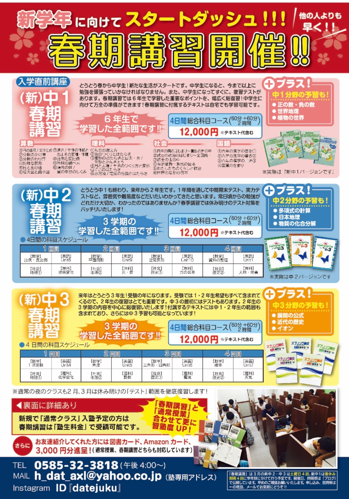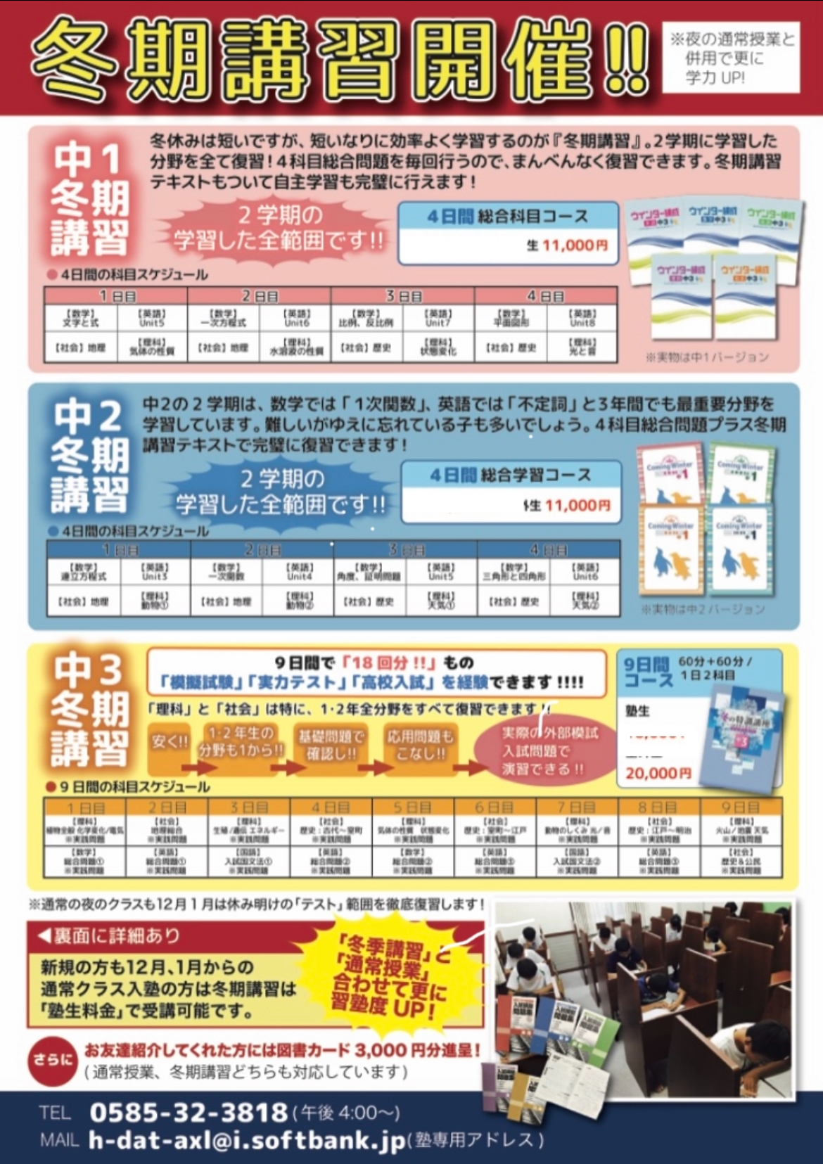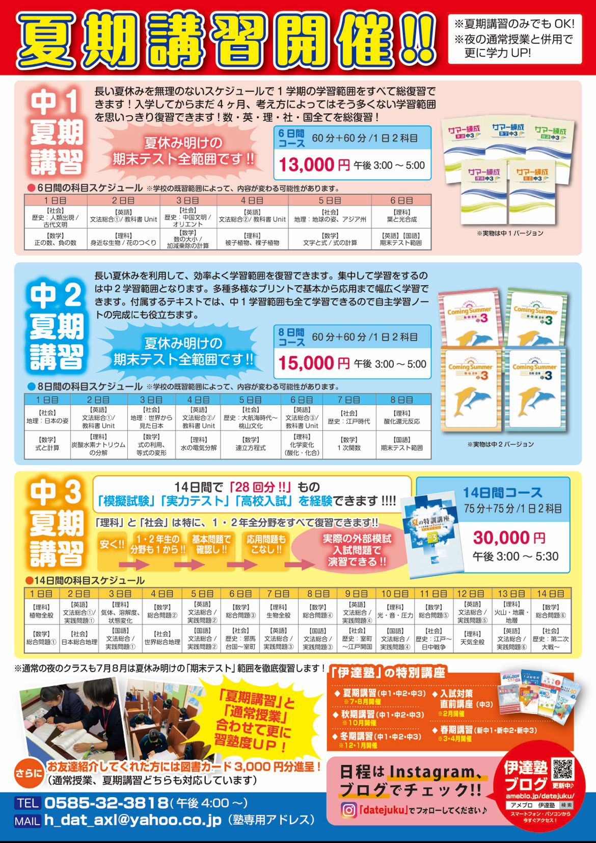 伊達塾では中学生対象に、通常授業とは別に @夏期講習 A冬期講習を毎年実施しております。 志望校へ向かい更なるレベルアップを目指して頑張りたい人はぜひ受講してください!